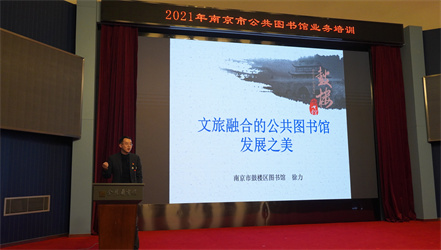 随后,鼓楼区图书馆党支部书记、副馆长徐力以《文旅融合的公共图书馆发展之美》为题作业务培训授课,从把握公共图书馆文旅融合的发展机遇、公共图书馆在文旅融合环境下的工作展望、公共图书馆在文旅融合环境下工作需要注意的问题三个方面,图文并茂地介绍了公共图书馆在文旅融合实践上的优秀经验。