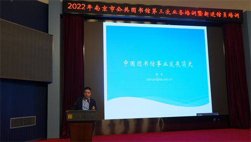 谢欢副教授首先作题为《中国图书馆事业发展简史》的专题授课,他从“图书馆员为什么需要了解图书馆史”这个提问开始,通过追源溯流式的讲授,罗列从辛亥革命时期至21世纪之间,不同时期中国现代图书馆事业发展的特征。