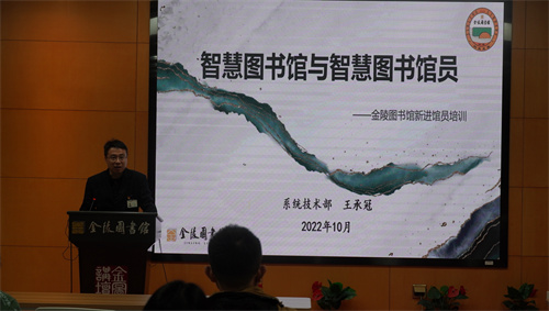 最后,金陵图书馆系统技术部王承冠主任以《智慧图书馆与智慧图书馆员》为主题作专题授课。他简要介绍了图书馆信息化发展简史,并着重介绍了金陵图书馆主要信息系统如文献信息管理系统、RFID智慧服务、“书服到家”项目等的运行情况,使新进馆员对智慧图书馆有了更深的了解。至此,培训内容全部完成。新进馆员们也将在培训结束后认真回顾授课内容,完成学习心得的撰写。