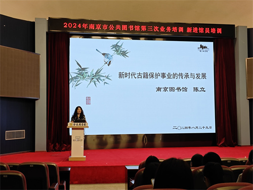 接着,另一位特邀嘉宾——南京图书馆党委委员、副馆长陈立作题为《新时代古籍保护事业的传承与发展》的培训讲座。她从古籍的相关基础知识谈起,引入到中华传统典籍之美,最后重点谈到古籍保护与活化利用,深入分析了新时代古籍保护事业面临的挑战与机遇。
