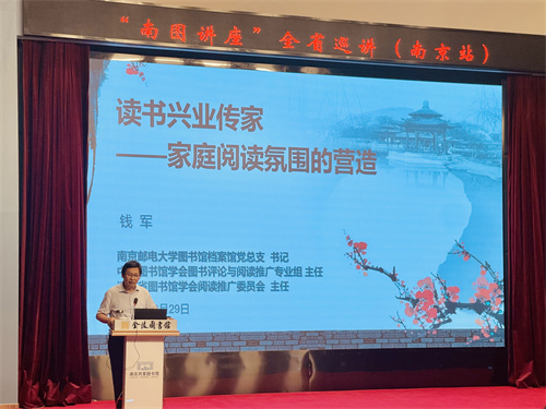 首日培训特别邀请了南京邮电大学图书馆、档案馆党总支书记钱军授课。本场培训还是“南图讲座”全省巡讲(南京站)金图首讲活动。他为大家带来题为《读书兴业传家——家庭阅读氛围的营造》的培训讲座。他围绕阅读观念的进步、家庭藏书的建设、阅读习惯的改善以及阅读传统的传承四大核心议题,为在座的馆员提供了宝贵的参考建议,鼓励图书馆工作人员积极发挥自身专业优势,推动家庭阅读氛围的营造,共同促进书香社会的建设。