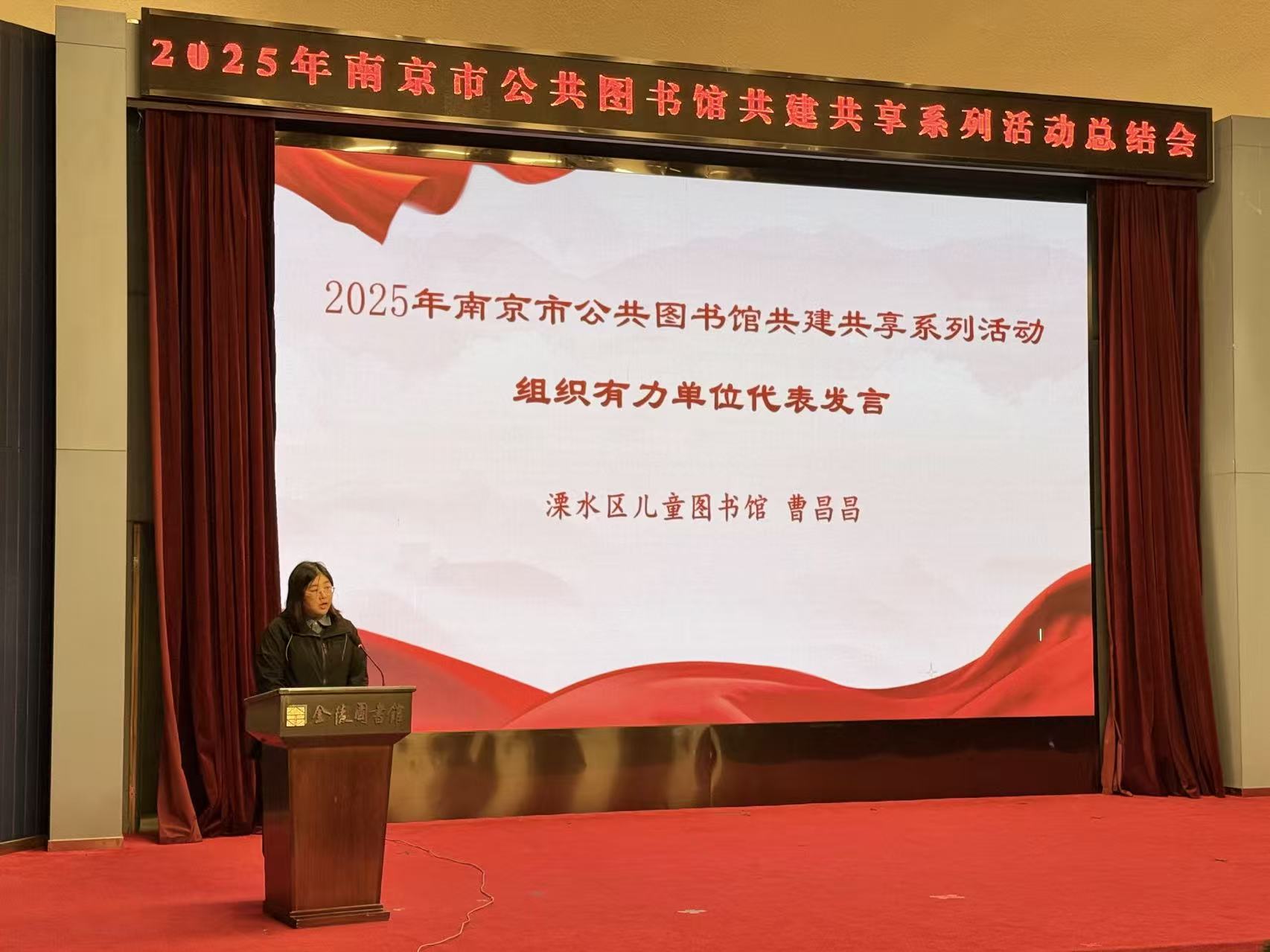 随后,尹士亮馆长宣读了2025年全市公共图书馆共建共享系列活动中表现突出、组织有力的单位名单。溧水区儿童图书馆馆长曹昌昌作为代表进行发言,分享了今年共建共享系列活动中的参与情况,工作经验与感悟,并表达了对市区联动工作的热情和对未来事业发展的信心。