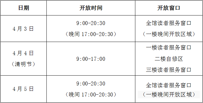 根据《国务院办公厅关于2021年部分节假日安排的通知》,金陵图书馆结合工作实际情况,将2021年清明节期间具体开放时间和开放窗口安排如下: