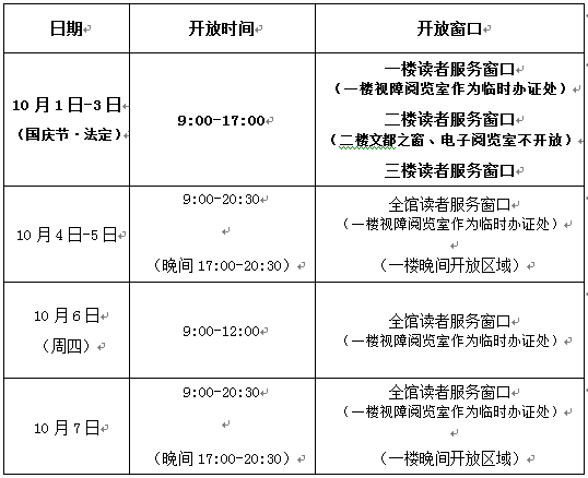 10月1日-3日(法定节假日)开放时间为9:00-17:00,晚间不开放;新街口地铁图书馆不开放。