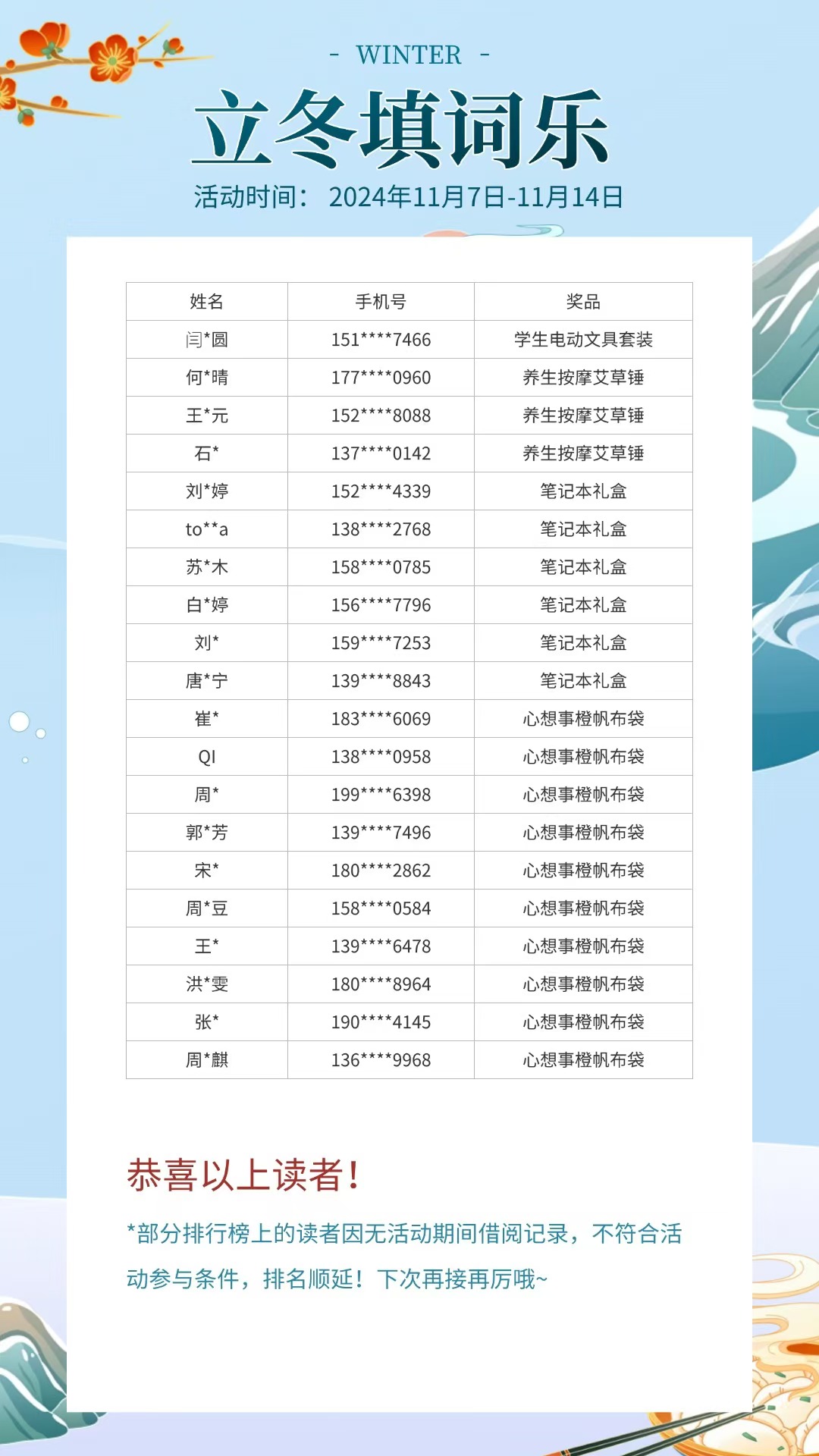 寒霜初降,时序轮回,今朝又逢立冬。古韵悠悠,诗意绵绵,南京共享图书馆特设一场别开生面的古诗词答题雅集,邀君共赴一场穿越千年的文化盛宴。让我们一同在诗词的海洋中,迎接冬日的第一缕曙光。恭喜以下的幸运的读者,请您尽快下单选择送书上门,奖品将随包裹寄出。