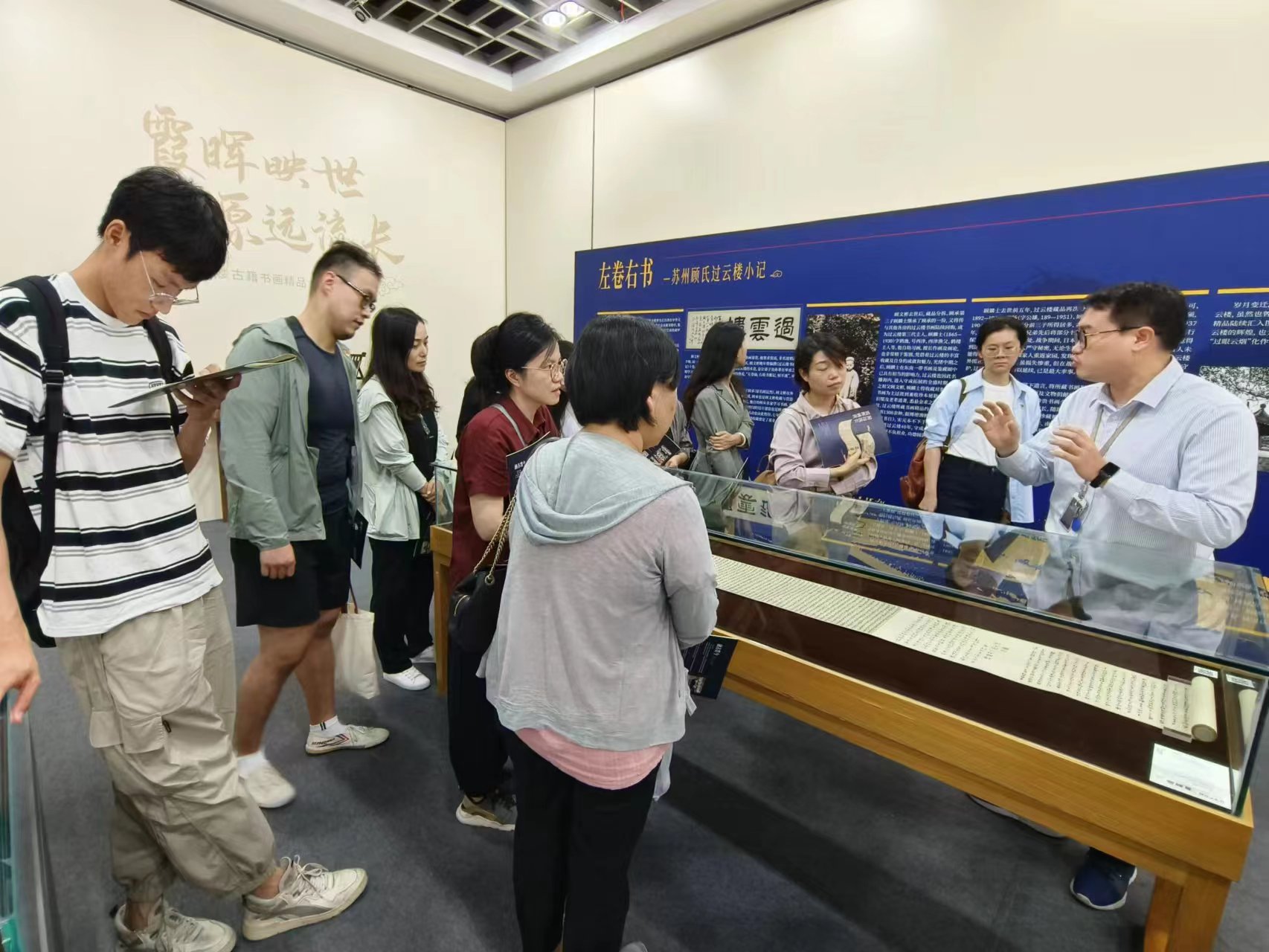 此次参观的展览主题为“霞晖映世 源远流长——百年‘过云楼’古籍书画精品合璧展”,由南京图书馆(江苏省古籍保护中心)、苏州过云楼顾氏家族与江苏凤凰出版传媒集团合作举办,汇集旧藏于过云楼的唐代至清代古籍和书画精品50种,唐宋气象、明清韵味,尽显其中。过云楼,取名于宋代苏轼《宝绘堂记》“书画于人如过眼云烟”之意,由苏州顾氏收藏的开创者顾文彬于1874年起开始建造,因收藏丰富、藏品珍贵,素有“江南收藏甲天下,过云楼收藏甲江南”的美誉。