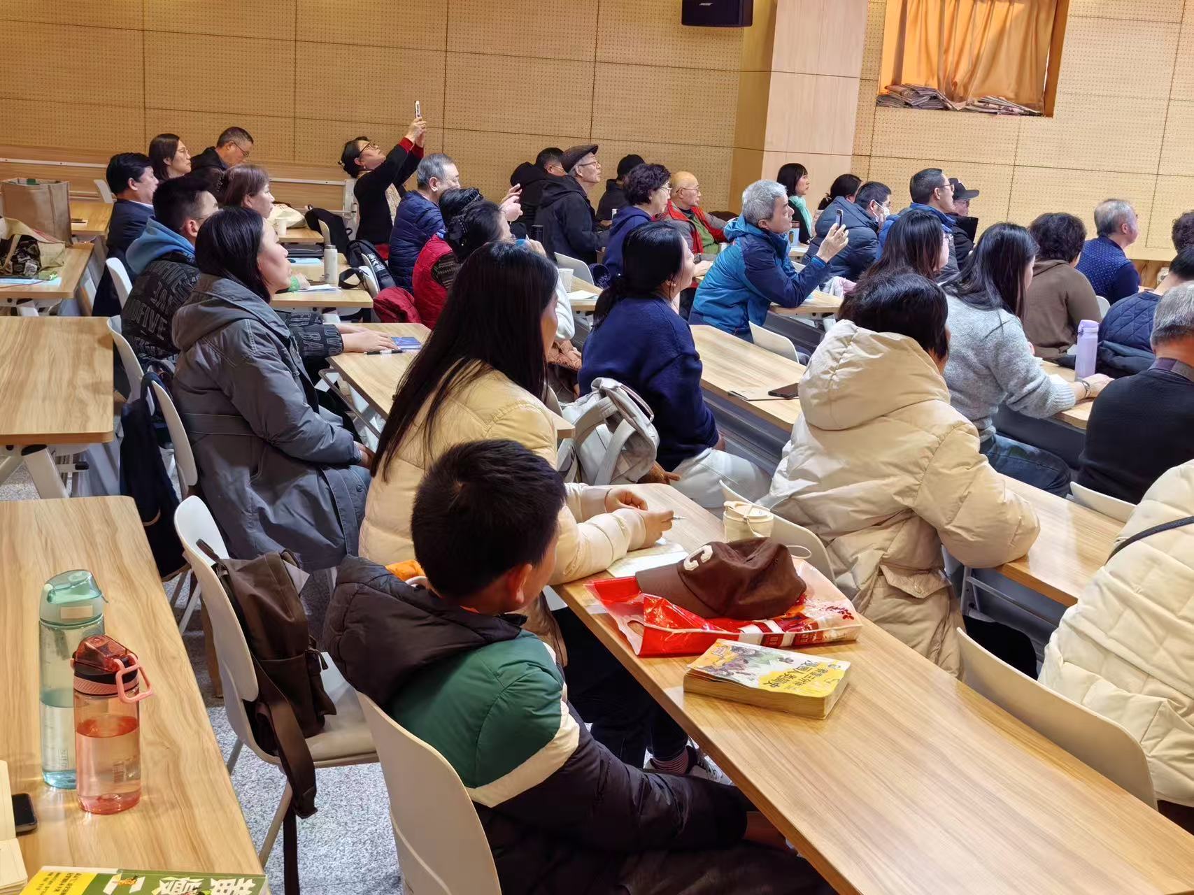 在近3个小时的讲座中,钟教授以深厚的学养和生动的解读,着重讲解了诗人在描绘自然景观时所用的修辞手法、色彩表达和诗词的张力等,让读者们在“诗中有画,画中有诗”的意境中,触摸中华文明的温度,浸润古典文脉之书香。现场既有热爱古诗词的退休读者,也有带着孩子共同聆听的家长,不少读者全程认真做着笔记,并在讲座结束后和钟教授互动交流,他们纷纷表示受益匪浅。