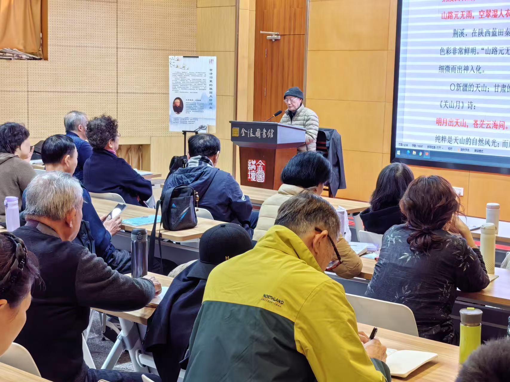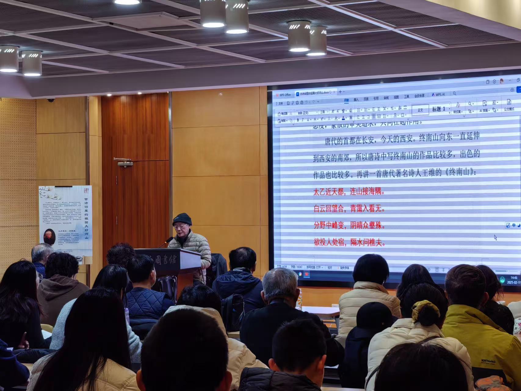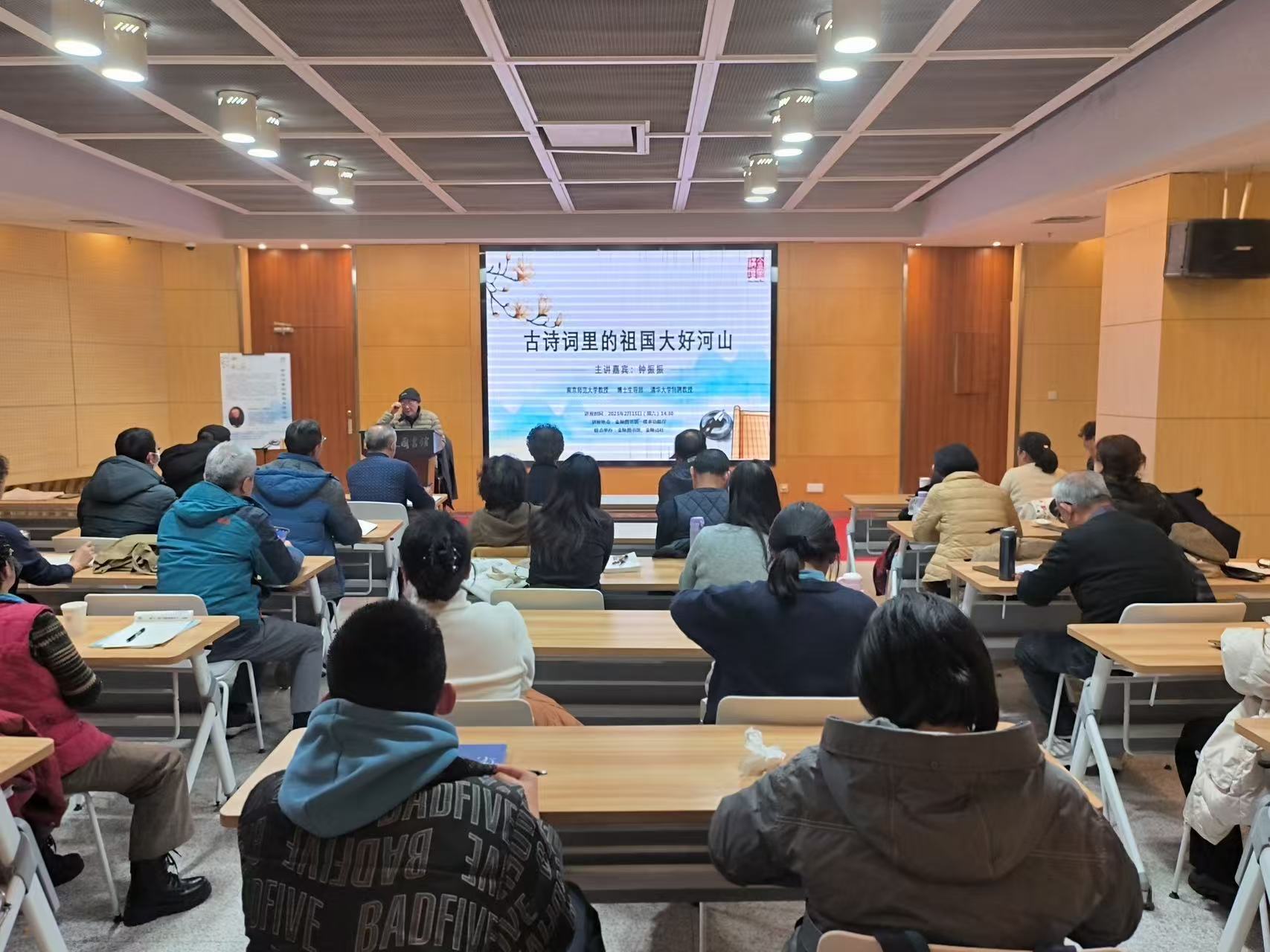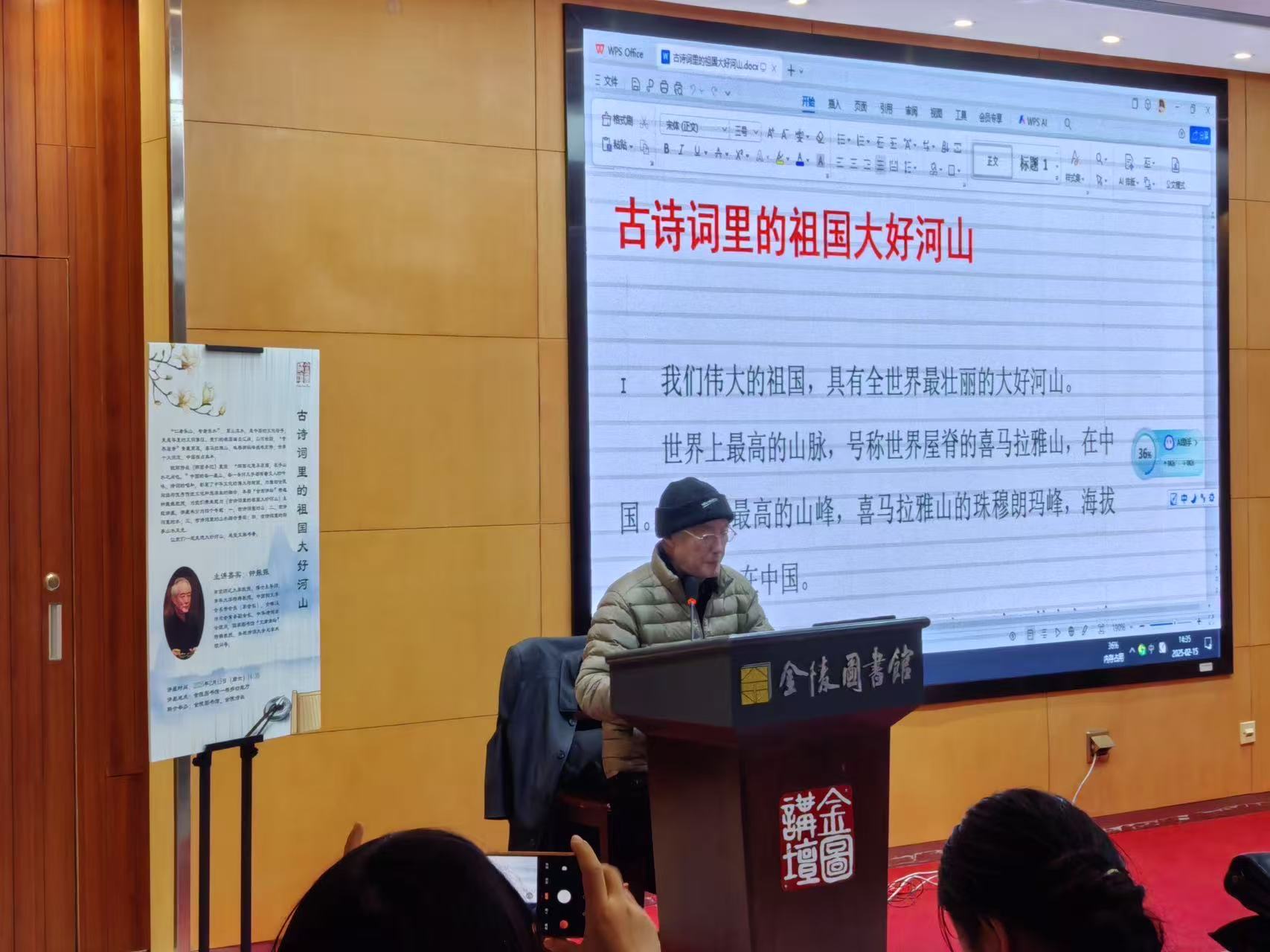 2025年2月15日14:30,央视诗词大会总学术顾问,南京师范大学教授、博士生导师,清华大学特聘教授钟振振做客“金图讲坛”,以“古诗词里的祖国大好河山”为题,带领近百名读者共赴一场跨越千年的山水诗旅。本期讲座由金陵图书馆、金陵诗社联合举办。