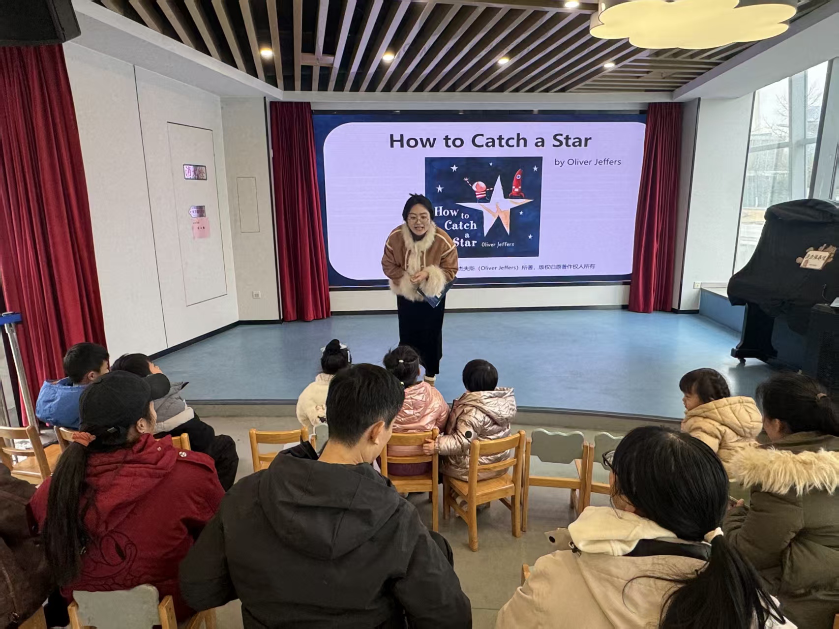 1月1日下午,【小水滴】英文读书会“爱与成长”元旦主题活动在金图少儿区小舞台举行。老师给孩子们带来英文绘本故事《How to catch a star》。