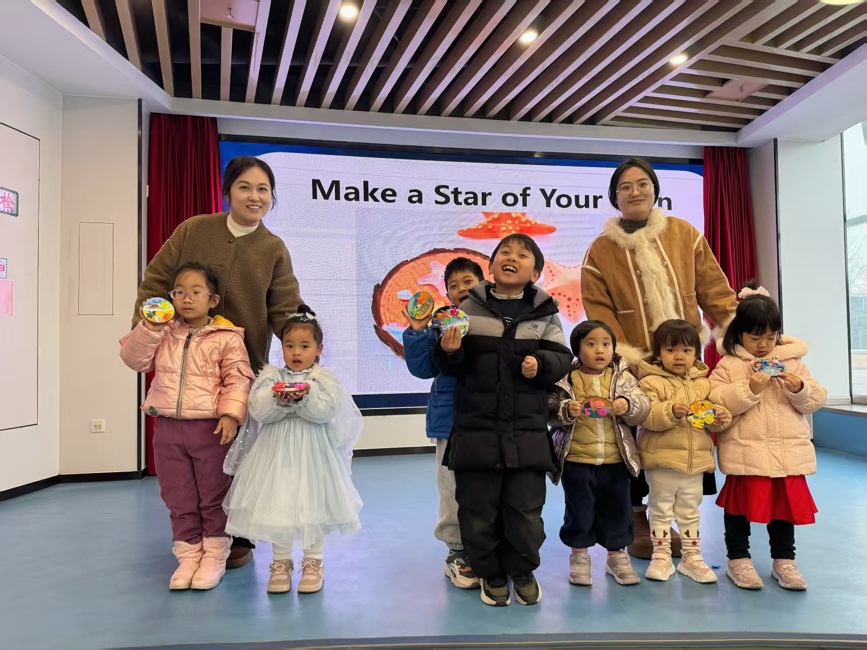 故事分享结束后,活动进入了充满创意的手工环节——“Make a star of your own”。在老师的指导下,孩子们和家长利用笔、黏土等材料,认真地绘画、拼贴、装饰,全心投入地制作那颗独一无二的、专属于自己的小星星。他们发挥天马行空的想象力,让手中的星星焕发出各异的光彩。
