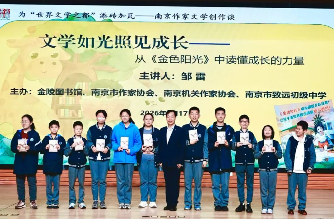 在第31个“世界读书日”与首个“全民阅读活动周”来临之际,为持续推进书香校园建设、传承金陵文脉、助力青少年健康成长,2026年4月17日,金陵图书馆联合南京市作家协会、南京机关作家协会、南京市致远初级中学,特邀文学创作一级作家、中国作家协会会员邹雷老师走进南京市致远初级中学,带来了“金图讲坛”《文学如光照见成长——从<金色阳光>中读懂成长的力量》主题讲座。南京市致远初级中学副校长杨菁、金陵图书馆社会活动部主任周樱格出席,活动由刘文君老师主持。
