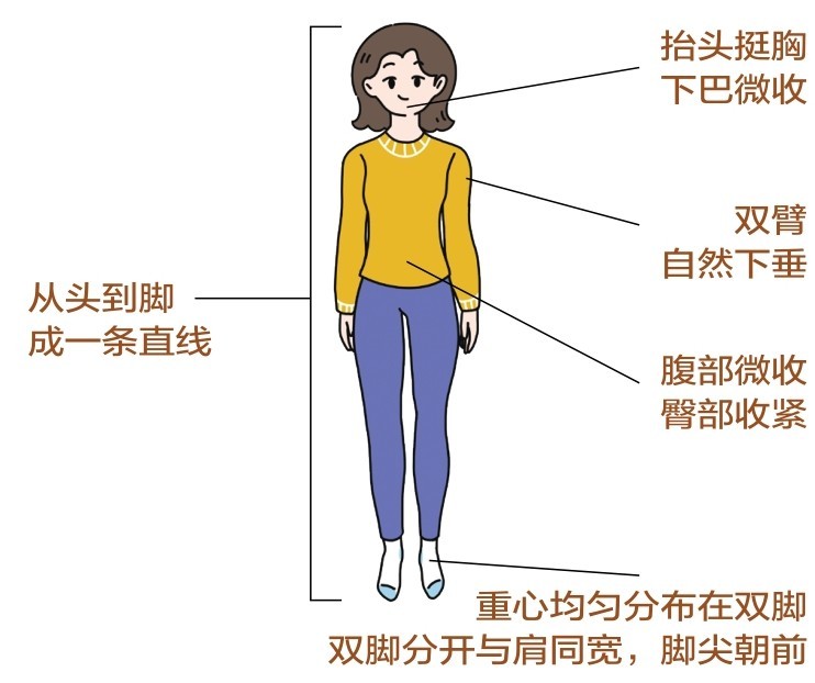 【注意】膝盖微屈不锁死,避免身体倾斜或含胸驼背,让全身肌肉处于均衡发力状态。