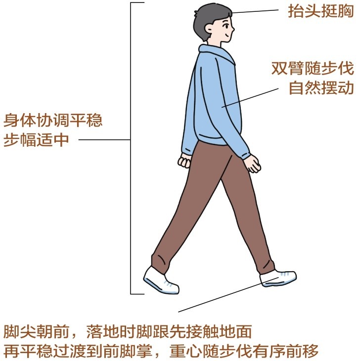 【注意】避免含胸驼背、踮脚走路及步幅过大,以减少关节和肌肉的不必要损伤。