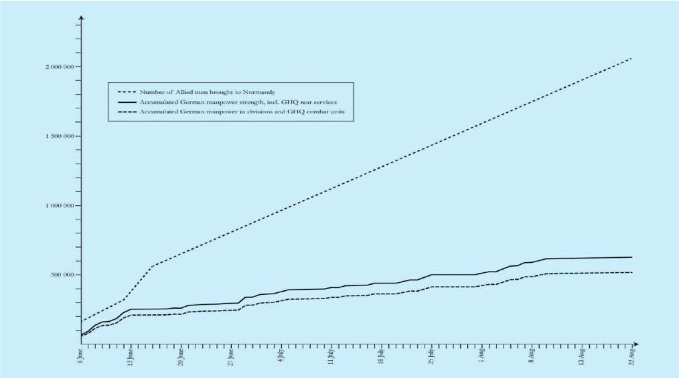 诺曼底战役的兵力投入情况,上方虚线是盟军累计投入兵力,实线是德军累计投入兵力