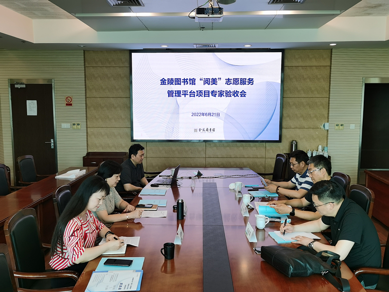 2022年6月21日9:30,金陵图书馆在四楼会议室召开了“阅美”志愿服务管理平台项目专家验收会。会议邀请了由南京图书馆副馆长吴政、东南大学图书馆馆长李爱国、南京邮电大学图书馆党总支书记钱军三位专家学者组成的专家组对平台项目进行验收。会议由金陵图书馆副馆长杨峥主持,活动服务部主任周樱格、项目承建方代表陈宏伟等参加了会议。