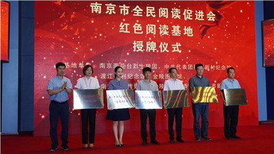 南京市全民阅读促进会副会长徐开利为活动致辞。他提出,全民阅读促进会的宗旨,就是要将“全民阅读”从一个口号切实落实为南京市民的一种生活方式。在这一推进过程中,公共图书馆是主阵地,出版社和书店是主渠道,而促进会在阅读办的领导下,就是联系各社会阅读组织的纽带与桥梁。陈会长表示,革命年代孕育的红色文化,积淀着中华民族最深层的精神追求,而阅读红色经典离不开红色场馆,也离不开红色阅读基地。此次诵读会上,南京市全民阅读促进会宣布将南京雨花台烈士陵园、中共代表团梅园新村纪念馆、渡江胜利纪念馆、金陵图书馆、南京出版传媒集团金陵书苑墨香缘、南京市新华书店六家单位列为南京首批红色阅读基地,并举行了授牌仪式。