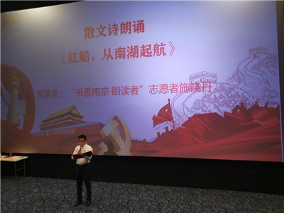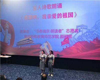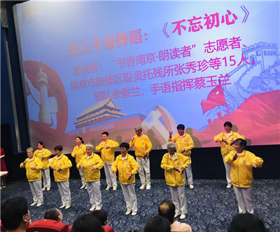 随后,“书香南京·朗读者”志愿者们共同献上一场主题的朗诵盛宴,以献礼中国共产党成立100周年和歌颂祖国为主要内容,除了精彩的朗诵,更有来自盲人读者和聋人读者的倾情演绎。来自南京特殊教育师范学院周文晴、颜鹂苇带来了一首诗人舒婷所写的爱国诗篇《祖国啊,我亲爱的祖国》,来自南京市鼓楼区聪灵托残所的聋人朋友为我们带来手语舞蹈《不忘初心》,用他们独特的方式表达了对党的热爱和忠诚。此外,还有《红船,从南湖起航》《祖国是什么》《党的赞歌》《我爱这土地》等声情并茂的朗诵,都表达出志愿者们对党的母亲发自肺腑的满腔情感。而来自金陵图书馆的四位大学生文化志愿者全程参与到活动的助残搀扶和礼仪服务中,尽显志愿者公益奉献的温情。