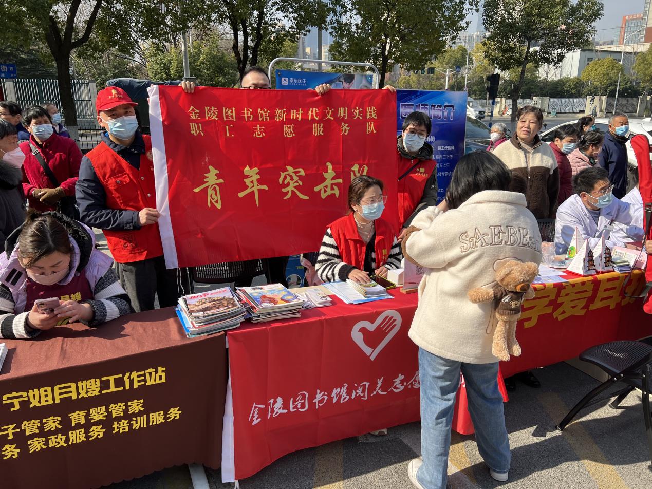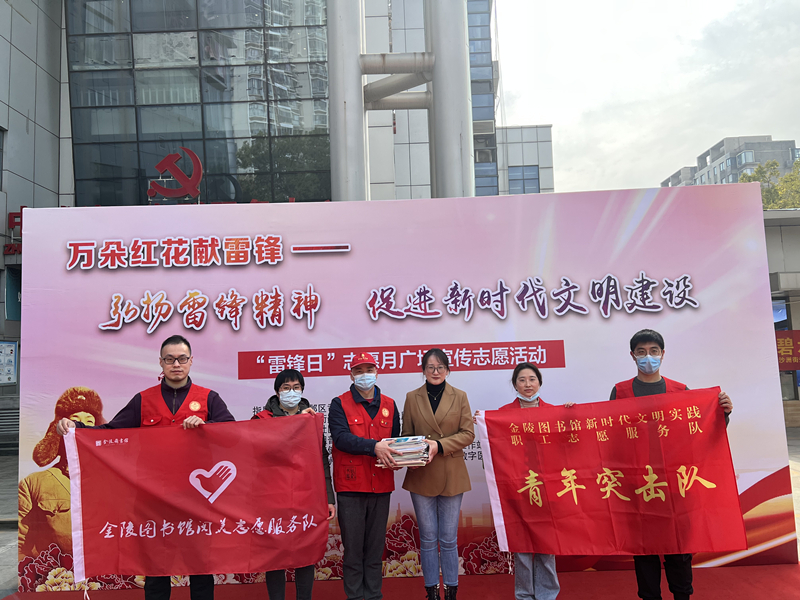 活动当天,金陵图书馆团支部书记、事业研究部胡宁涛,活动服务部甘旭扬、系统技术部管婷婷、分馆建设部孔瑶、综合阅览部肖剑锋组成的金陵图书馆“阅美”志愿服务队、金陵图书馆新时代文明实践职工志愿服务队赶赴现场,通过书服到家、免费办证、分发杂志等公益文化服务,将公共文化服务深入到街道、社区,用实际行动践行雷锋精神。