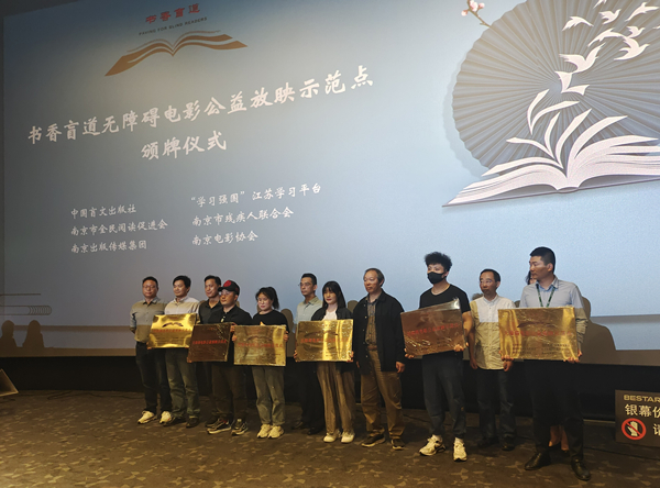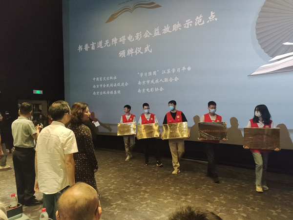 2023年5月19日上午9:00,启动仪式在南京市鼓楼区吾悦广场星轶影城举行。来自省、市多家单位的朗读志愿者们,以朗诵、歌曲、合唱等形式,歌颂祖国、礼赞生命、弘扬正气、歌颂南京、全面贯彻落实党的二十大精神。随后,指导方和主办方领导向各家电影院颁发了“无障碍电影公益放映示范点”铜牌。一年内,多达100多部无障碍电影公益放映即将在各大示范点影院陆续上线。