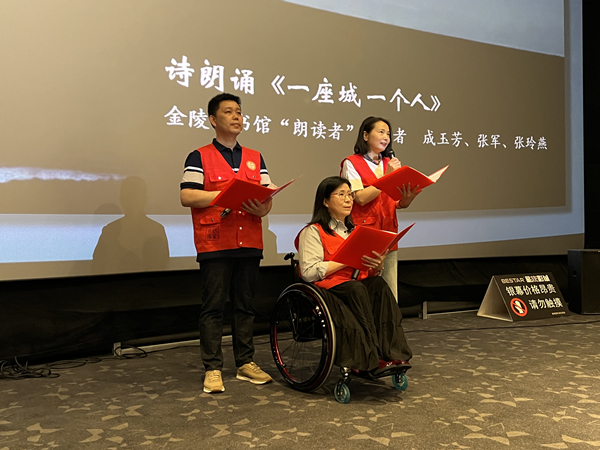 其中,金陵图书馆“阅美”志愿服务队“朗读者”志愿者成玉芳、张军、张玲燕带来的诗朗诵《一座城 一个人》,赢得了现场观众的热烈掌声。