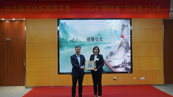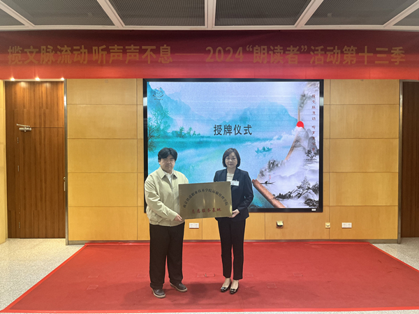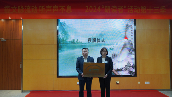 “朗读者”项目的成长壮大离不开来自社会、学校以及四面八方的爱心注入,在授牌环节,中国邮政集团公司南京市建邺雨花区分公司总经理汪弋向金陵图书馆授予“文化志愿者服务基地”铜牌,南京铁道职业技术学院运输管理学院团总支书记吕孟壕向金陵图书馆授予“志愿服务基地”铜牌,金陵图书馆“阅美”志愿服务队又有了新生力量的加入。随后,中国邮政集团公司南京市建邺雨花区分公司副总经理单宏向金陵图书馆赠送《全民阅读邮票》镜框,杨馆长代表金陵图书馆接受赠送,并表达了诚挚谢意。