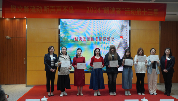 金陵图书馆活动服务部主任周樱格宣布了2023年度在金陵图书馆志愿服务活动中表现优异的志愿者团队,他们是:东南大学外国语学院、南京工程学院、南京审计大学润园、三江学院、南京特殊教育师范学院(予希社)、南京扬子江朗诵艺术团、南京一枝梅文化传播有限公司志愿服务队。杨馆长代表主办方金陵图书馆授予他们“优秀志愿服务团队”称号,并希望志愿者们秉承“奉献 友爱 互助 进步”的志愿精神,为全民阅读推广贡献力量,打造南京作为世界“文学之都”与全球学习型城市的志愿名片。