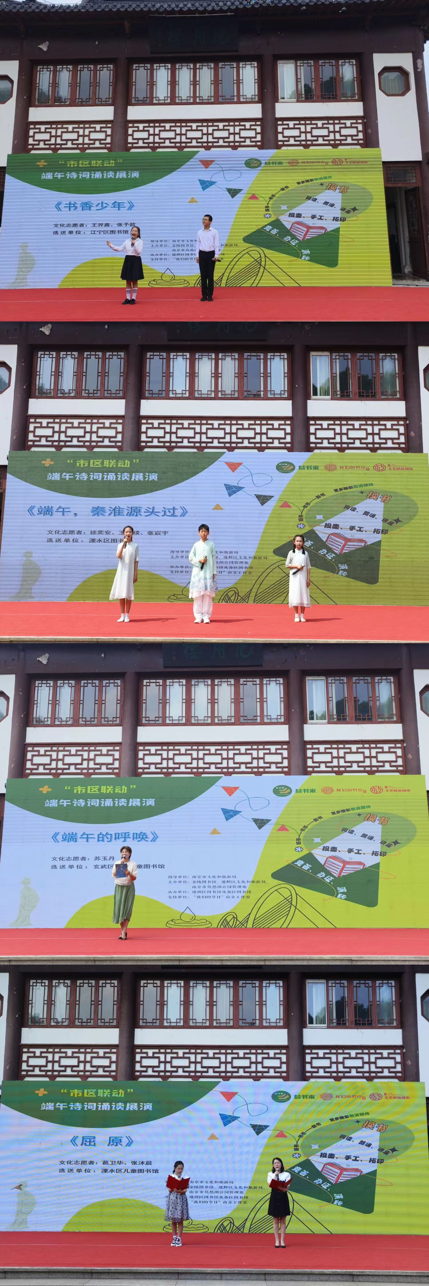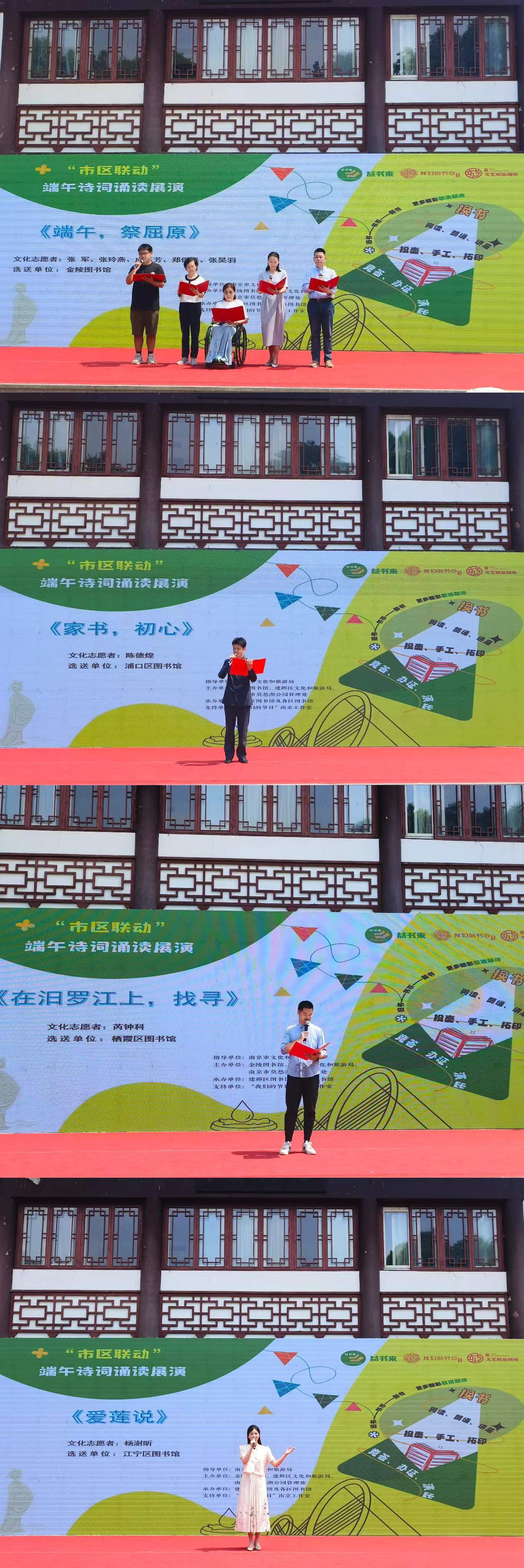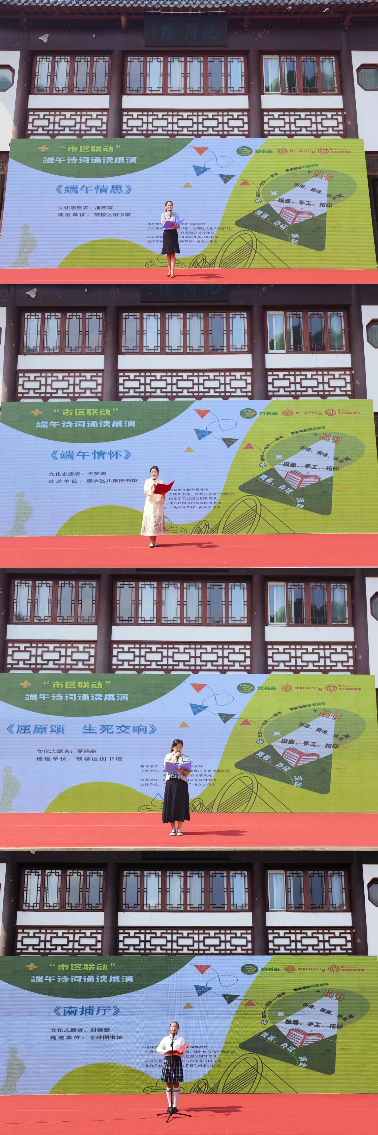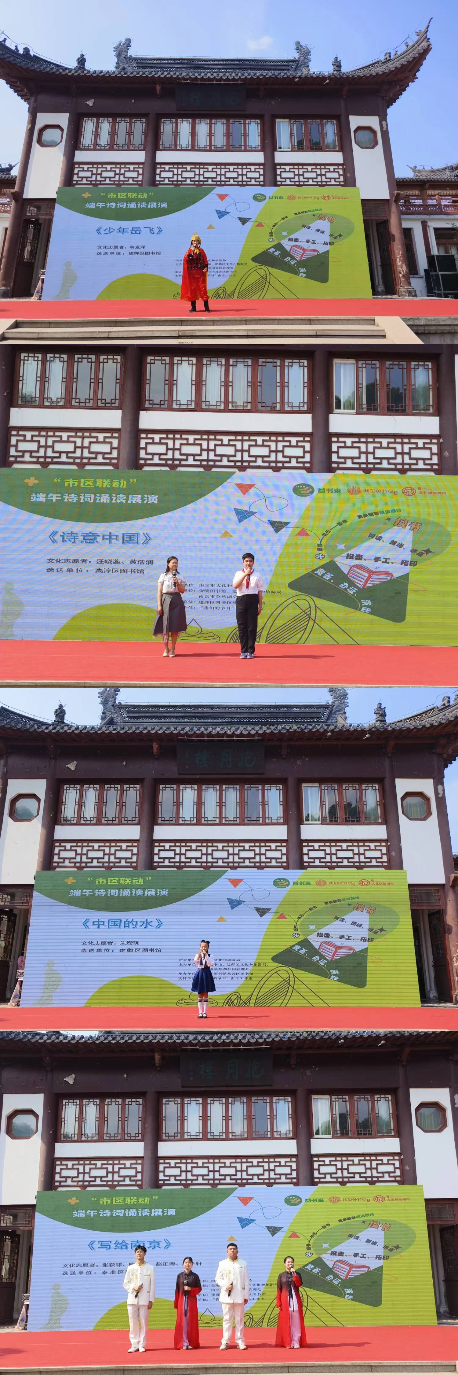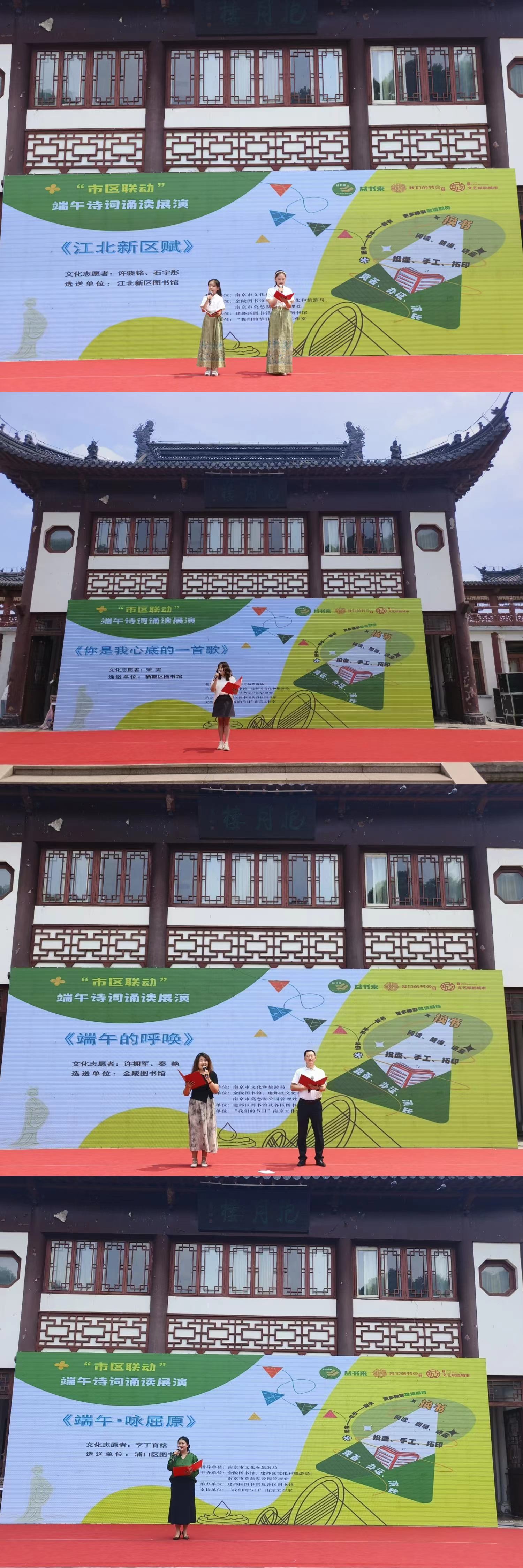 作为本次活动的重要组成部分,在抱月楼前的表演区域,“市区联动”端午诗词诵读展演分别于10:00—11:00、14:00—15:00精彩呈现。来自南京市各区公共图书馆精心挑选的朗读志愿者们以字正腔圆的发音,深情演绎了一首又一首经典诗词,用公益诵读的方式弘扬中华优秀传统文化。