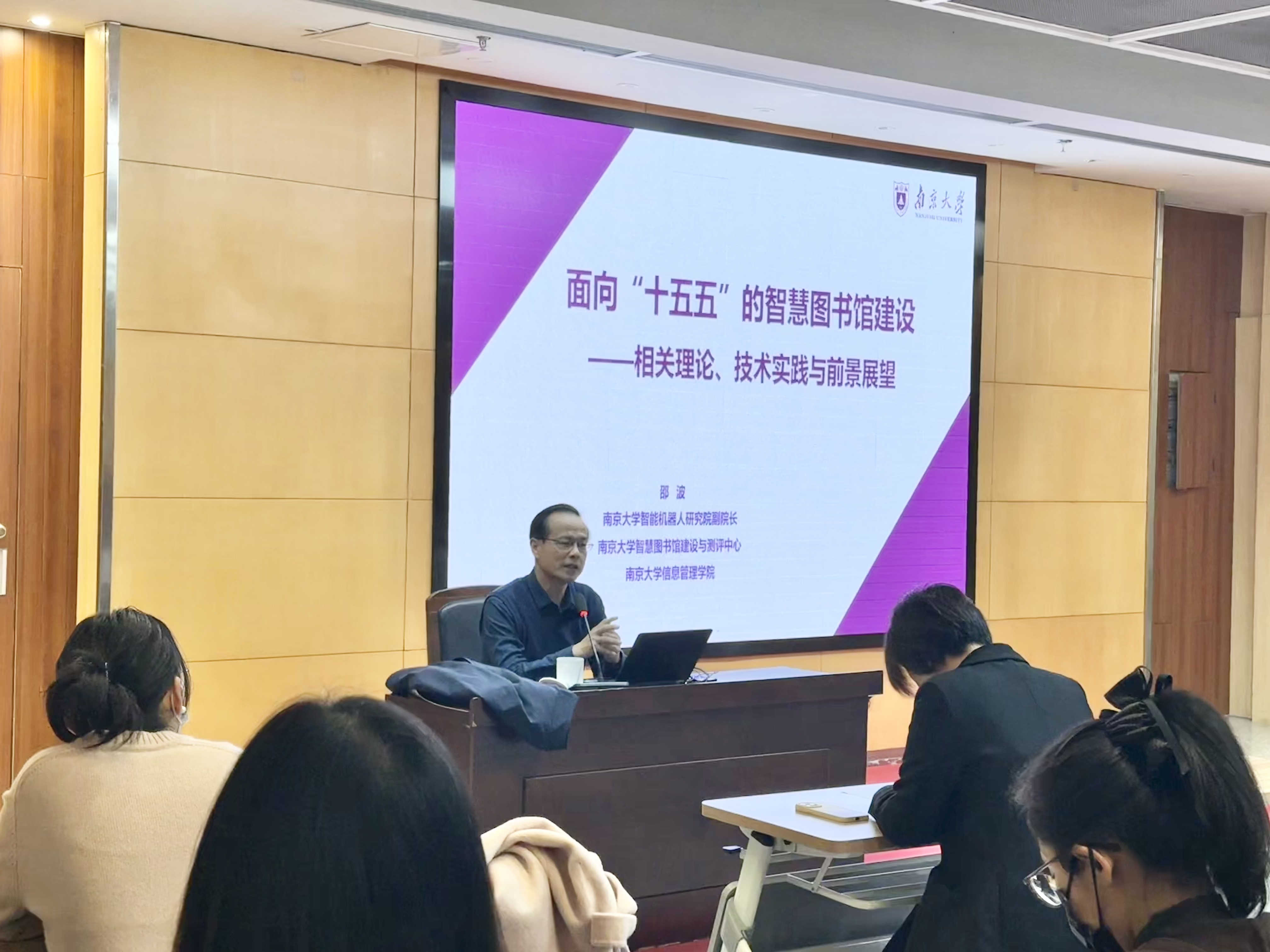 南京大学智能机器人研究院副院长、智慧图书馆建设与测评中心主任邵波教授,在《面向“十五五”的智慧图书馆建设——相关理论、技术实践与前景展望》报告中,剖析了在AI for Science全球战略背景下,图书馆面临的范式革命。他指出,图书馆必须从传统的“资源仓储”向具备知识萃取、交互与进化能力的“认知中枢”转型,实现从资源服务向知识服务的跃迁。邵波教授系统阐述了从图书馆服务平台(LSP)到知识服务平台(KSP),最终迈向 “DeepLibrary” 生态体系的演进路径,并分享了南京大学图书馆“南雍闻道”AI科学服务平台的创新实践。