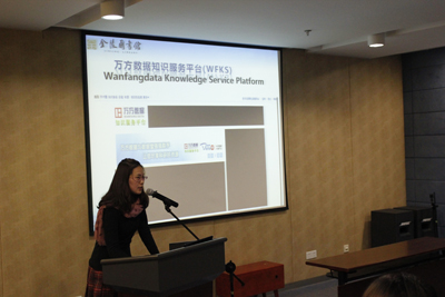 2012年11月28日下午,上海万方数据有限公司张蕾讲师为听众做了系列讲座的第一讲:馆藏万方数据知识服务平台。她从选题、立题、资料、写作、质量把控、成果发表及学术交流六个方面介绍万方数据知识服务平台可为用户提供的文献资源及增值服务。