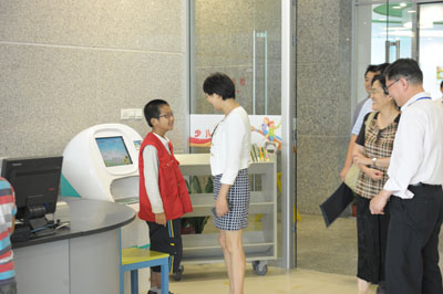 徐宁一行首先来到图书馆外借部,这里开架陈列有30万册新书,是馆内读者借阅量最大的服务窗口,她仔细询问了无线射频技术图书自助借还设备使用效果情况;在少儿部,与正在参加管理值班的义务小馆员亲切交谈;她非常关心图书馆暑期活动的开展,在会展区,视听室正在为周边社区群众播放文化信息资源共享工程视频纪录片,她看到后给予肯定;当在二楼看到这里坐满了前来读书学习的读者时,她高兴地说,这说明南京的市民爱读书,社会需要图书馆;在善本古籍书库,她察看了馆藏国家二级以上线装古籍的保护情况,并观看了金陵图书馆珍贵文献展,认真听取图书馆严峰馆长对各类馆藏珍贵文献的介绍。