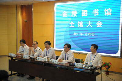 7月20日下午,金陵图书馆在多功能厅召开了“2017年中全馆大会”。会上馆领导通报了2017年上半年相关工作情况,介绍了下半年主要工作开展思路,提出了若干指导性建议。大会由方炜副馆长主持,全馆所有在岗员工到场参会。