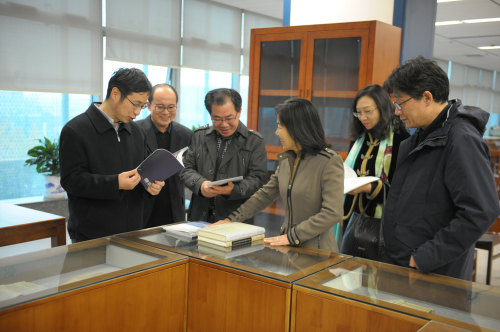 参观结束后,陈彬斌副司长、杨树发处长在四楼会议室就我馆古籍保护工作的整体情况进行了深入了解。尹士亮副馆长首先介绍了我馆及全市各区公共图书馆的古籍存藏情况,并重点汇报了我馆古籍普查、修复、知识普及以及数字化建设等方面开展的工作。陈司长在听取汇报后,就目前全市古籍保护工作在设备条件、服务水平、人才培养以及数字化进度等方面存在的问题进行了详细了解。