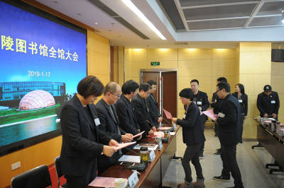 春临大地百花艳,节至人间万象新。1月17日下午,金陵图书馆在一楼多功能厅召开全馆大会。会上,馆领导先后宣布2018年度“先进工作者”名单,通报2018年度全馆工作情况以及介绍2019年工作要点和发展思路。大会由方炜副馆长主持,全馆在岗员工到场参会。