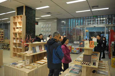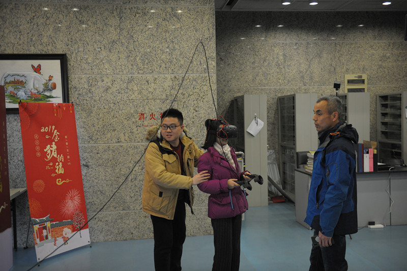 离开展览厅,徐局长一行分别到一楼的图书借阅室、金图文创商店和二楼的电子阅览室、艺术设计阅览室等区域进行参观与慰问。虽然已临近春节,但阅览室里看书和自习的读者仍然很多,文创商店里也有读者在选购商品。在二楼的艺术阅览室里,徐局长还饶有兴致地参与了我馆春节期间开展的“欢乐祥瑞·金猪纳福:VR贺新春”数字文化虚拟现实体验活动。