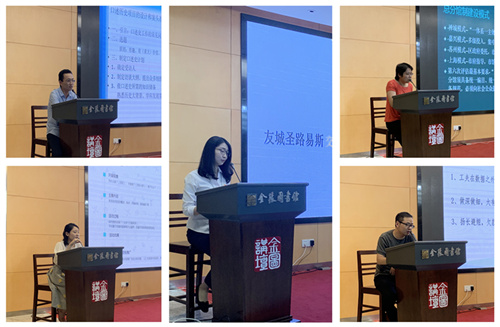 首先,综合阅览部的卞海波老师给大家介绍了参加中国传媒大学崔永元口述历史“从零开始学做口述历史名师工作坊”的学习情况。他详细介绍了培训中的5门课程,包括口述历史项目的设计和案头准备、具体的采访过程、文本的整理、档案管理和编目以及国际前沿的理论与案例等等,同时还结合我馆实际提出了金陵图书馆口述史项目建设的工作计划。随后,文创发展部的汪然老师与大家分享了友城圣路易斯交流之行。她从圣路易斯郡图书馆与金陵图书馆的渊源谈起,生动地讲述了这次交流活动的背景、内容以及背后的小故事,并对加强我馆国际交流与合作提出了近期的计划和远期的展望。接着,公共服务部的孙振强主任从总分馆制的发展历程、建设模式、服务特点、基本类型以及城市书房建设等方面,将她在全国图书馆总分馆制暨“城市书房”建设研讨班上汲取到的先进理念和值得推广的做法与大家进行了分享。办公室的王亦淇老师则重点从上海图书馆的创新服务案例以及图书馆业务案例怎么写两个方面分享了她在图书馆服务创新及案例写作培训班上的培训心得。最后,采访编目部的彭飞主任向大家介绍了他赴淮安市图书馆和淮阴师范学院图书馆调研交流的情况及启示,为我馆进一步提升文献资源建设质量、提高工作效率提供了有益的借鉴。
