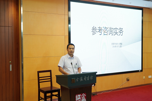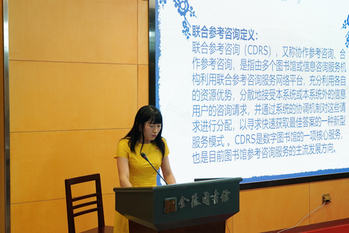 图书馆的参考咨询业务是现代图书馆的主要业务之一, 通过收集整理各类信息资源,为政府企事业机关及个人提供文献信息服务。金陵资源开发部纪景超主任为大家带来了题为《图书馆参考咨询实务》的讲座。讲座从参考咨询的定义和演变趋势谈起,着重介绍了“南京市公共图书馆联合参考咨询系统台”的诞生和实际使用情况。