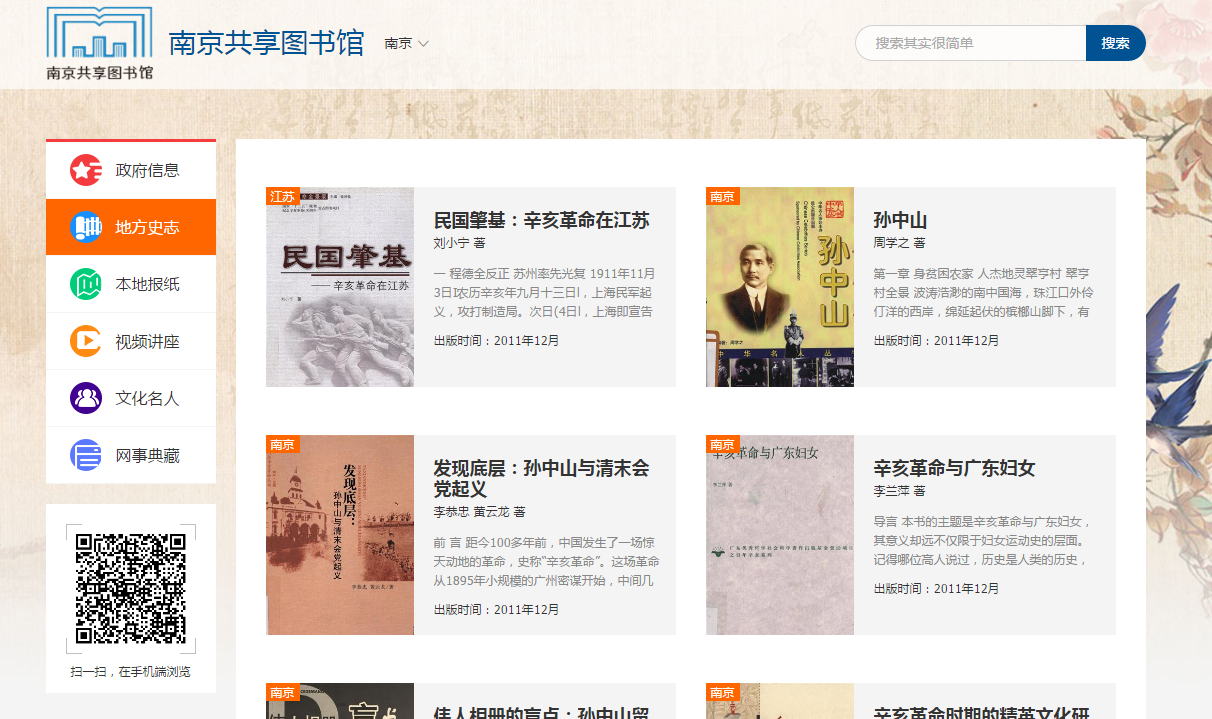 2019年11月30日,“南京共享图书馆——地方文献数字化平台”正式上线,该平台面向全网读者提供南京地区地方文献特色自建资源,内容包括政府信息公开、地方史志、本地报纸、视频讲座、网事典藏等五大模块,包括电子书、电子报纸、视频资源、地方政务信息等多种形式的数字资源。