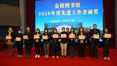 随后,方炜副馆长宣读《金陵图书馆关于表彰2020年先进工作者的决定》并宣布获表彰人员名单。在激昂的音乐声中,35位获表彰人员踌躇满志的走上主席台领奖并与馆领导合影留念。