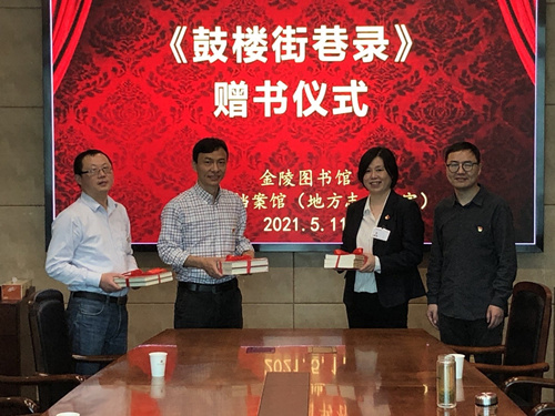 潘洁副馆长代表金陵图书馆向盛馆长颁发收藏证书,并回赠《金陵图书馆》、《南京市公共图书馆藏古籍善本题录》等书籍,以示感谢。金陵图书馆作为全市的文献资源保障中心,向来重视南京地方文献的征集和收藏,与各方志办等地方文献的生产单位建立了良好的合作关系,本次《鼓楼街巷录》“落户”金陵图书馆即为双方协作交流,共同传承地方文化和红色文化的一大成果。