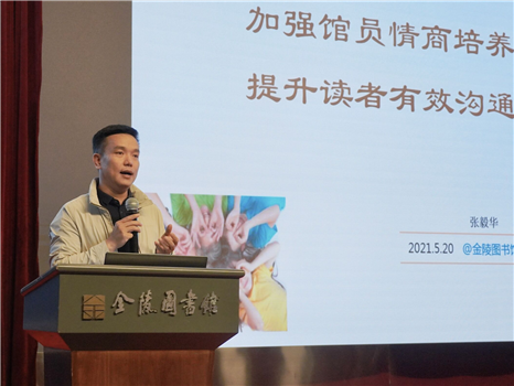 首先,张毅华副馆长以“加强馆员情商培养,提升读者有效沟通”为主题,从“何为情商”“有效沟通”“如何提升”三个方面,详细阐述了沟通过程中情商的重要性。他指出:“情商就是指一个人在情绪方面的管理能力,是指个人对自己情绪的把握和控制,对他人情绪的揣摩和驾驭,以及对人生的乐观程度和面临挫折的承受能力等。”他还以一段力克·胡哲的视频,向馆员们展现了高情商的智慧。