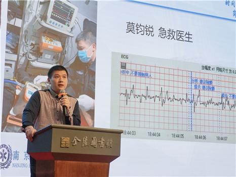 其后,莫钧锐医生以“‘救’在身边,从‘心’启程”为主题,与大家分享了南京市急救中心以及“小梅花”志愿宣讲团的服务理念及心得体会。作为南京市急救中心的一支志愿服务团队,“小梅花”志愿宣讲团一直在向社会各界努力地宣传急救理念和知识,曾荣获2020年度南京市优秀青年志愿服务集体。而莫医生作为宣讲团的一员,除了完成日常的院前急救工作和新冠疫情防控工作,还在持续地开展急救知识和急救技能的宣讲活动,通过这些志愿活动贡献自己的力量。