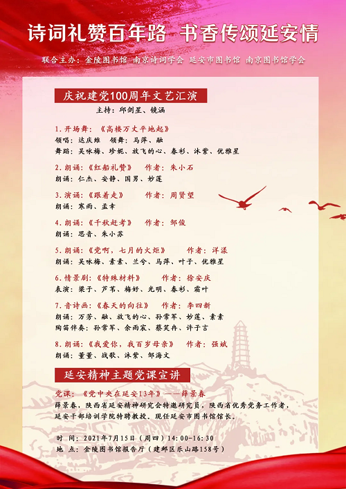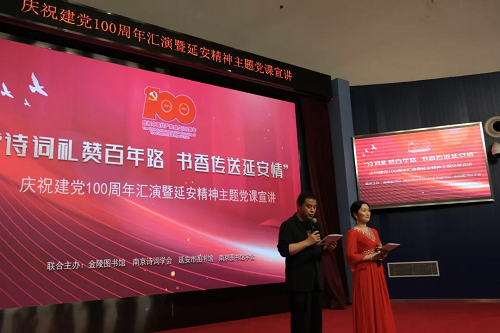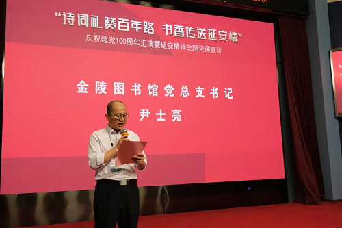 为庆祝中国共产党建党100周年,增强全体馆员爱党爱国情感,进一步传承红色基因,赓续红色血脉,弘扬革命精神,7月15日下午,“诗词礼赞百年路,书香传颂延安情”主题文艺展演暨延安精神主题党课宣讲活动,在金陵图书馆一楼报告厅成功举办。