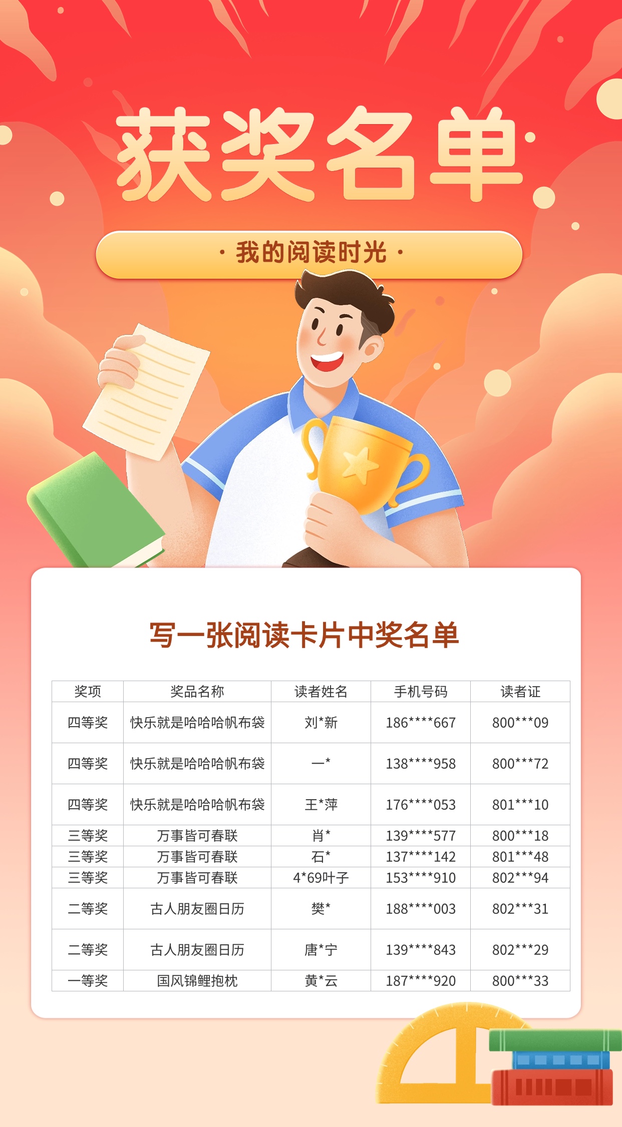 此次活动创新了阅读推广形式,推动网借服务与阅读互动深度融合,搭建了读者交流平台,引导读者在回顾与规划中深化阅读体验,助力更多读者走进书籍、坚持阅读。活动虽已落幕,阅读从未停止。未来,我们将持续推出贴近读者的阅读活动,完善网借服务,优化阅读体验,搭建更多交流平台,让书香浸润生活、让阅读成为习惯。恭喜以下的幸运的读者,请您尽快下单选择送书上门,奖品将随包裹寄出。