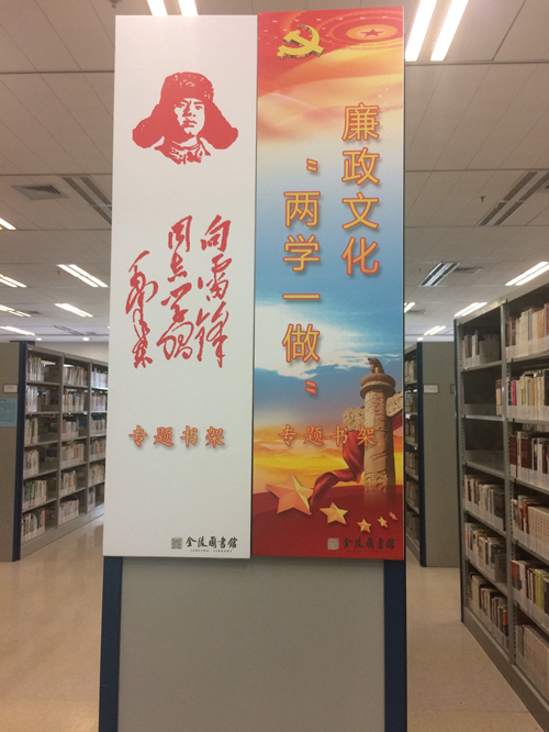 一楼图书外借部推出的“两学一做”专题书架精心选取了300余种图书,以“两学一做”学习教育为主线,内容涵盖党建工作、先进模范、理论学习等方面,覆盖面广、时效性强、借阅率高。专题书架的推出,配合了廉政文化的主题,向广大读者提供了理论学习资源服务、营造了良好的学习氛围。