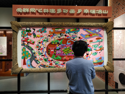 然后,一行人来到了位于冶山街道的六合农民画党性教育体验馆,体验馆共分为两层,一楼是党性教育基地,二楼是农民艺术画展厅。在讲解员的引导下,先后参观了体验馆的序厅、党的历史、先进模范、农民画展区以及廉政走廊5个区域,大家在回顾党的光辉历史的同时,也看到了社会主义现代化建设的勃勃生机。