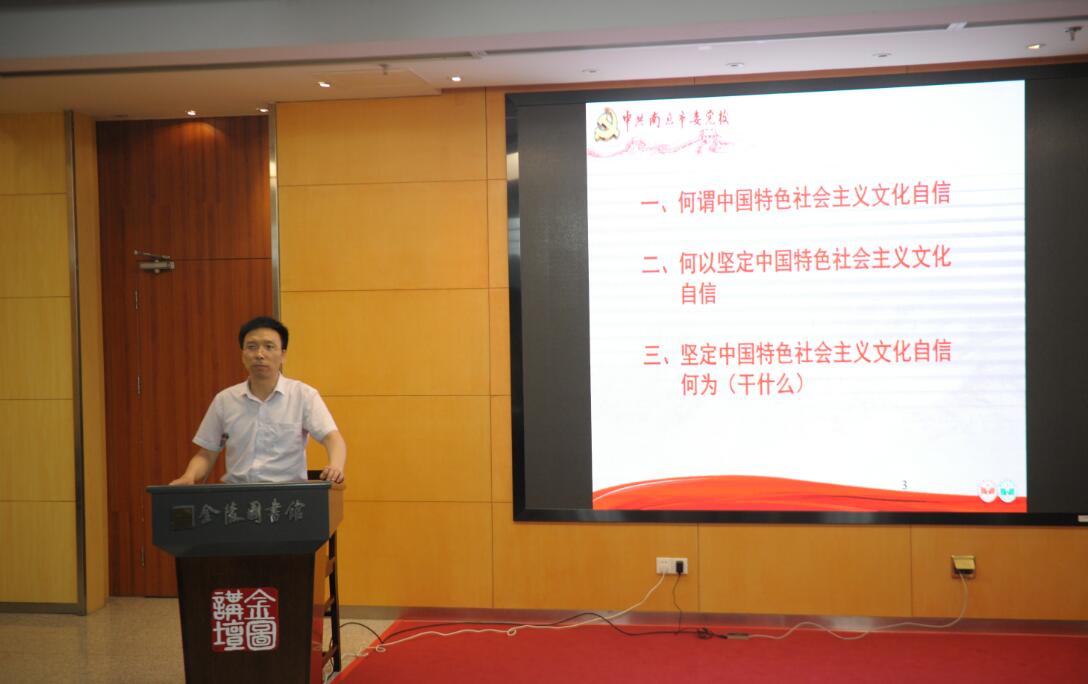 习近平总书记指出,“文化自信是一个国家、一个民族发展中更基本、更深沉、更持久的力量”。为深入学习宣传贯彻党的十九大精神,深入开展“不忘初心、牢记使命”主题教育,迎接第98个“七一”建党节,6月27日上午,金陵图书馆第三党支部党员听取了题为《坚定中国特色社会主义文化自信》的党课。本次讲座作为南京市公共图书馆馆长暨业务骨干培训班课程之一,特别邀请了中共南京市委党校教授、校务委员郭榛树教授为大家授课,从理论高度阐明了文化自信对图书馆事业的重要意义。