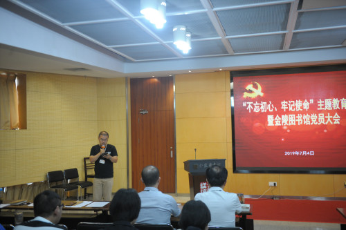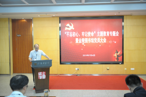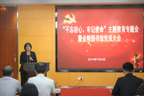 为了贯彻落实《关于开展“不忘初心、牢记使命”主题教育的实施方案》的通知要求,深入学习习近平新时代中国特色社会主义思想,7月4日下午1:30,“不忘初心、牢记使命”主题教育专题会暨金陵图书馆党员大会在一楼多功能厅召开,会议由总支委员刘宁珏同志主持。