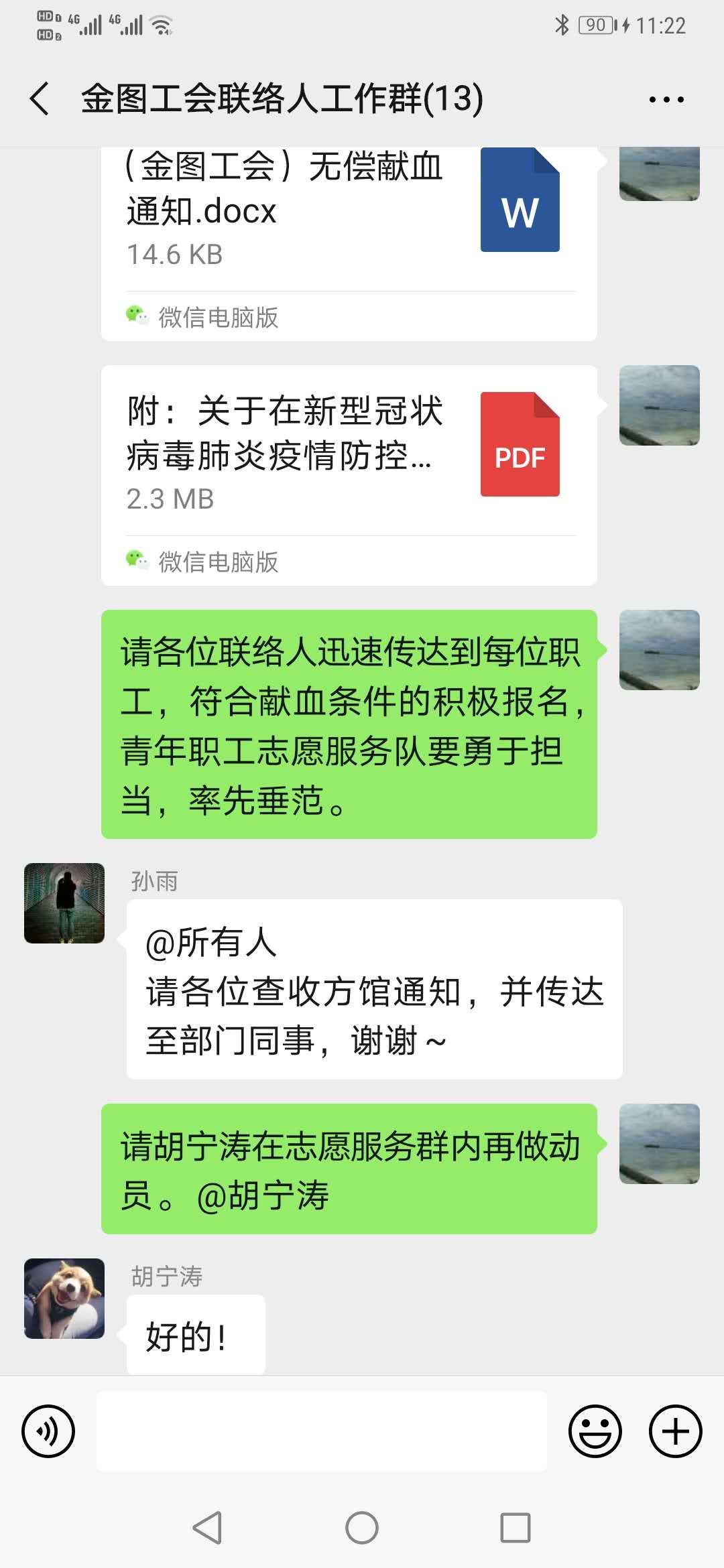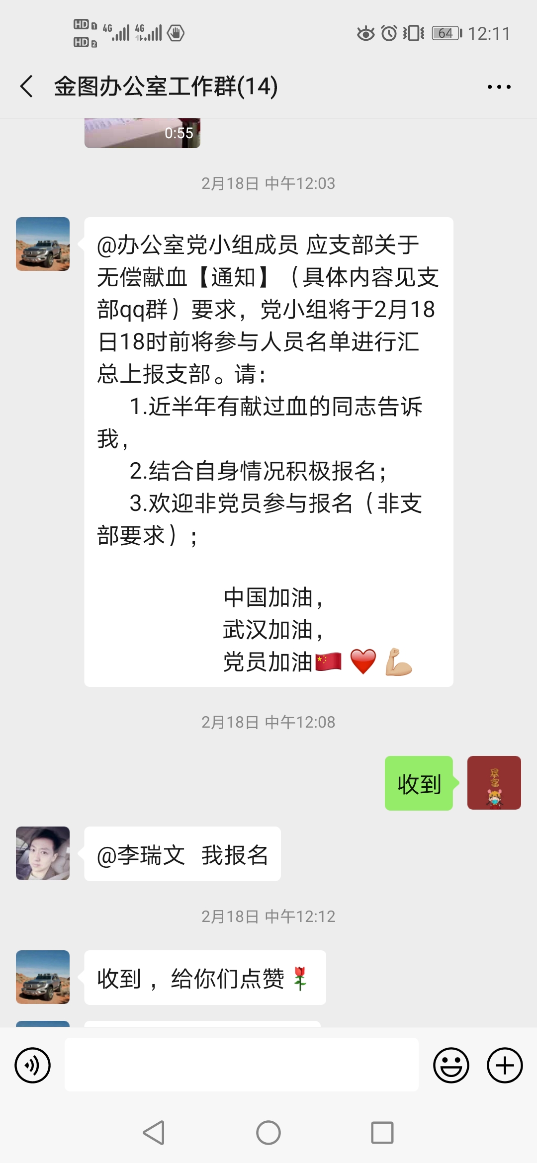 发出的献血倡议通知得到了图书馆广大党员、团员和群众的大力支持和积极响应。一句句“我报名!”“有我一个。”“我再献一次。”的线上接力,用热情和态度展现了图书馆人的责任和担当。此次献血是在发生疫情的特殊时期,对献血有许多诸如疑似接触、小区疫情、时间限制等额外要求。特别一提的是,馆里已有部分党员同志在疫情刚发生时,已默默无闻主动献过了血。这些原因限制了许多同志的报名。在不到一天的时间里,还是有33名同志成功报了名。其中23名党员、7名团员、3名群众。没有报名成功的一些同志也纷纷表示,等符合了时间限制等条件,自己再前往献血点去献血。