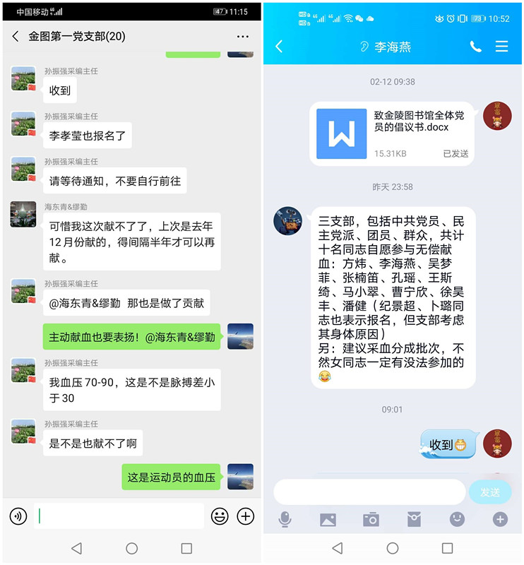2月18日,为全力做好疫情防控期间血液应急保障工作,金陵图书馆党总支积极响应上级号召,联合馆工会和团支部全面动员和部署,共同组织开展抗疫情无偿献血活动。根据《关于在新型冠状病毒感染的肺炎疫情防控期间启动血液应急保障预案的通知》等上级文件精神,图书馆发出无偿献血倡议,并通过党支部、馆工会、团支部等在线上广泛宣传动员。倡议共产党员在特殊时期要发挥好模范带头作用,携手共青团员和群众积极奉献,在为武汉地区图书馆同仁捐赠防护物资的同时,再为疫情防控做一份贡献,献一份爱心。