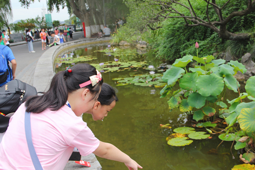 从玄武门下来,一行人到达本次活动的第二站——被誉为“金陵明珠”的玄武湖。此时湖中的荷花开得正盛,成片的荷叶挨挨挤挤,延伸到远方,点缀在碧绿的荷叶中的花朵,浅于朱红,粉于洁白。“接天莲叶无穷碧,映日荷花别样红。”孩子们纷纷拿起手机拍下美景,发出赞叹。儿童与大自然有一种天生的亲近感,孩子们一路欢声笑语,穿梭在玄武湖的洲、桥、老建筑之间,用镜头去探索、发现和记录玄武湖的自然美景,探寻玄武湖的人文内涵。